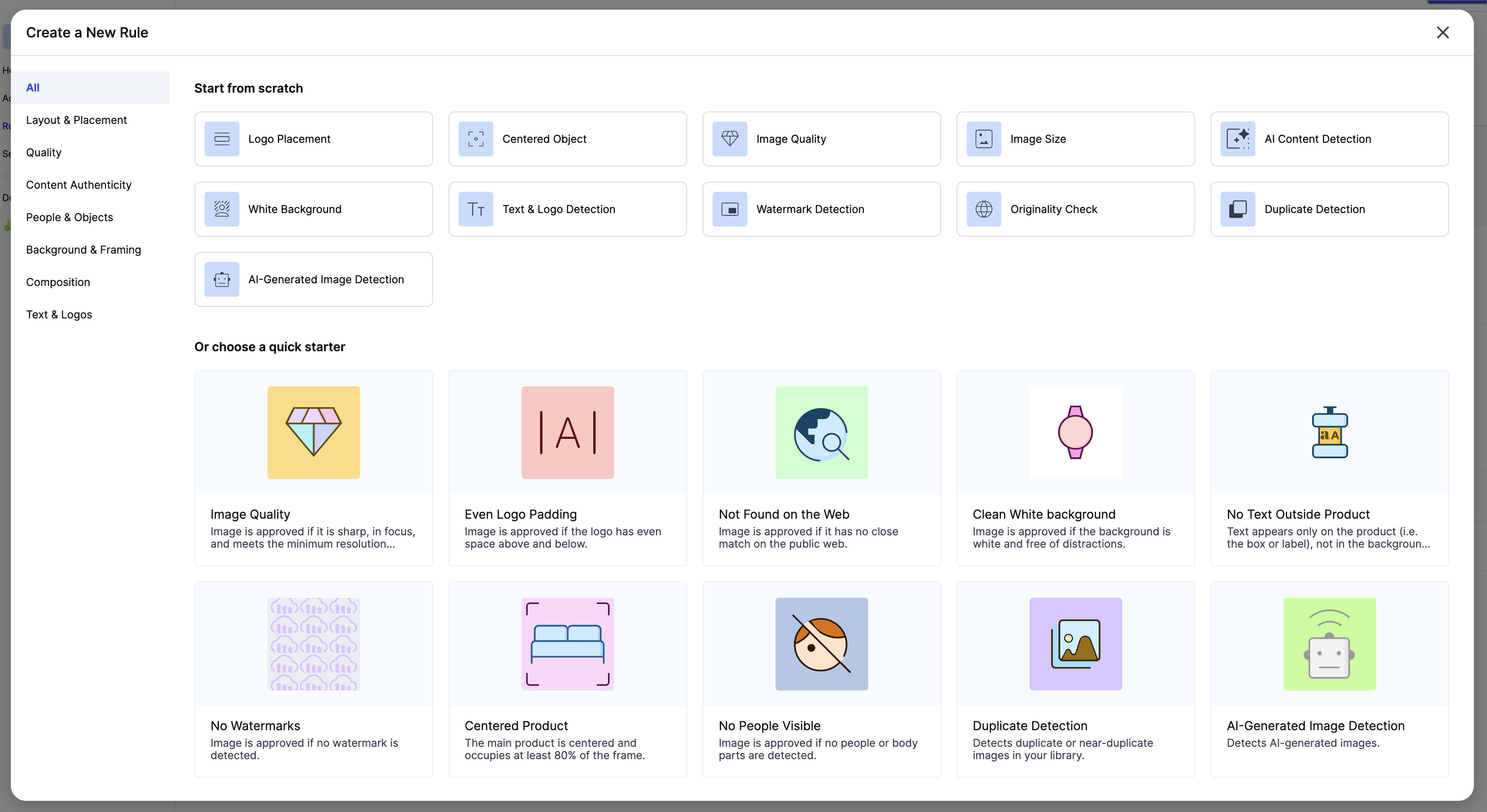 Start quickly with pre-defined rules that cover common quality, brand, and compliance checks. Add custom rules to reflect your specific brand guidelines as needed. -